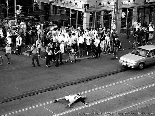 Longboarders skating down yonge street during rush hour traffic to take back the streets. To help promote longboarding, alternative transportation, and freedom to skate with no dollar sign attached to it. My good friend ben pulled me out to starbucks to listen to him rant like usual. ;-) This time he had a great idea, he called it the boardmeeting. He had a dream where people skate boarded to work instead of taking their cars. He asked me to help organize the photographers for it.